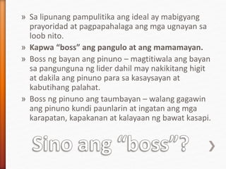 Pamahalaan at Serbisyong Panlipunan DRAFT. Programa ng pamahalaan para sa mamamayan 2021. Ito ay para sa kaayusan katiwasayan at kaunlaran ng kani-kanilang pamayanan May karapatan at tungkuling gingampanan ang mga pinuno at nasasakupang mga Pilipino noong sinaunang Pilipino.