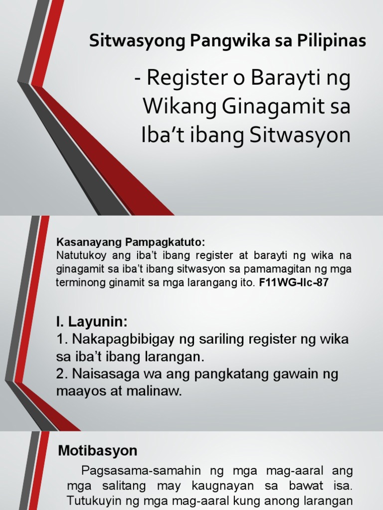 Register o barayti ng wikang ginagamit sa ibat ibang sitwasyon. Start studying Sitwasyong pangwika sa pamahalaan. Tab 01 X Search Tool Sitwasyong Pangwika sa Kalakalan Subalit sa kabilang banda mapapansin na pinanatili ang paggamit ng wikang Filipino at iba pang barayti nito sa mga merkado sa bansa at maging sa mga pabrika at pagawaan.