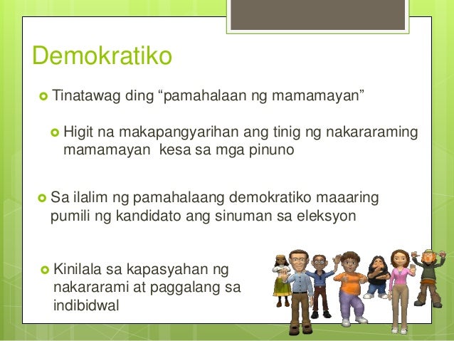 δημοκρατία dēmokratiā mula sa dēmos mga tao at kratos pamamahalaan ay isang uri ng pamamahala kung saan may awtoridad ang mga tao upang piliin ang kanilang namamahalang lehislasyon. Bangladesh - Parlamentaryong Demokrasya Monarkiya REpublika 7. Ang demokrasya bilang isang uri ng pamahalaan ay dapat na ginagarantiyahan ang paggana ng dalawang pangunahing instrumento.