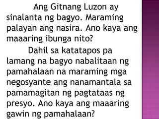 UGNAYAN NG PAMILIHAN AT PAMAHALAAN SAMANTHA MANGUBAT IX-rizal Ano nga ba ang PAMILIHAN AT PAMAHALAAN. Sa ganitong pagkakataon kinakailangan ang pakikialam ng pamahalaan sa takbo ng pamilihan. Ano ang napansin ninyo na tinutukoy ng.