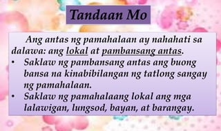 Categories DepEd Resources Post navigation. Ang lokal at pambansang antas. Mga Antas ng Pamahalaan Objective Natutukoy ang saklaw ng pambansang pamahalaan at pambansang lokal.