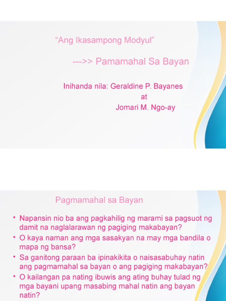 View pagmamahal-sa-bayanpptx from DCEE 12778 at Cavite State University Main Campus Don Severino de las Alas Indang. Sa modyul na ito inaasahang. AP - Tayahin Q4 W3.