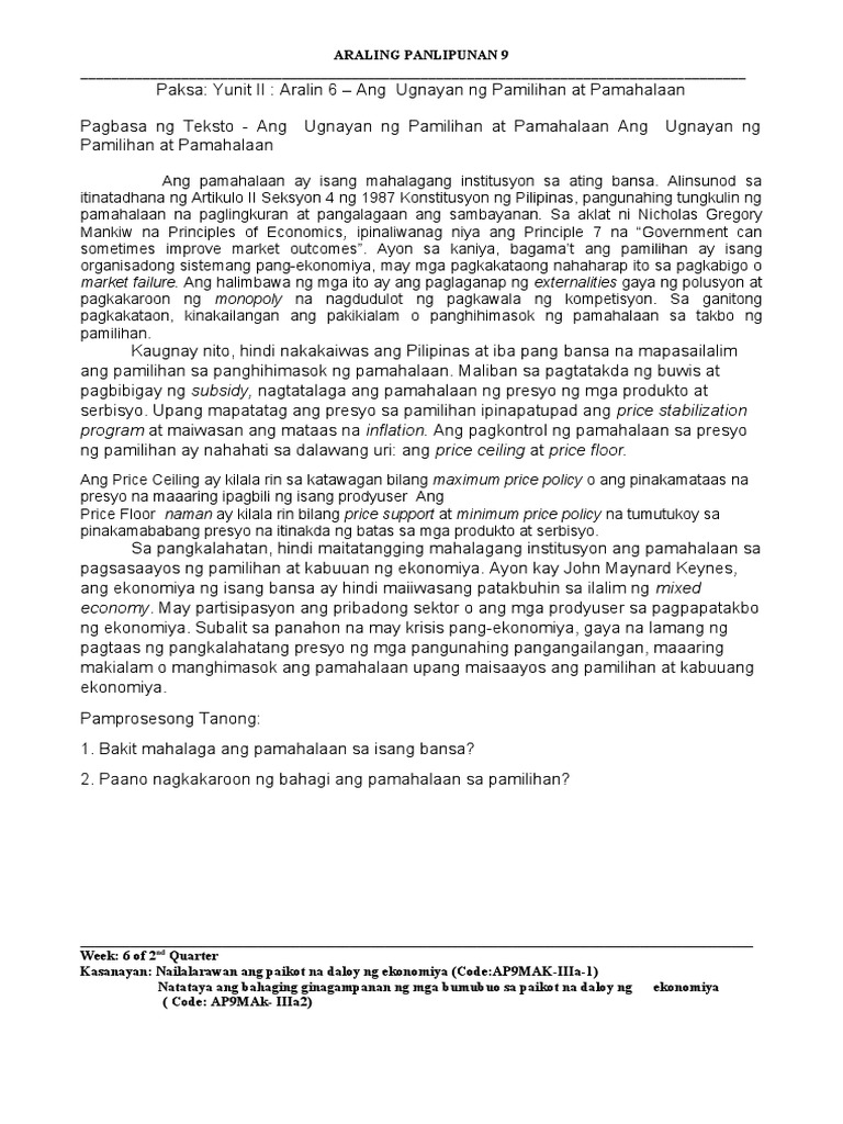 Aralin 6 Ang Ugnayan Ng Pamilihan At Pamahalaan