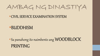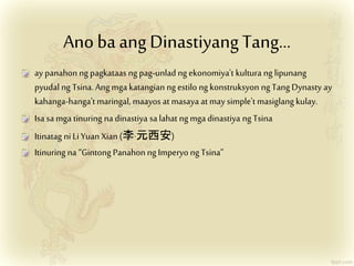 Dinastiyang Tang Ito ay pangalawa sa dakilang dinastiya ng Tsina ang dinastiyang Tang at itinuring ang Tang bilang isa sa mga dakilang dinastiya ng China Sentralisado ang Pamahalaan Nanumbalik ang kasiglahan at kasaganaan ng lipunan at kulturang tsino. Sinupil niya ang mga estado sa hilaga at timog Tsina. Nagtagal sa kapangyarihan ang dinastiyang Han ang pumalit sa dinastiyang Qin ng lampas sa 400.