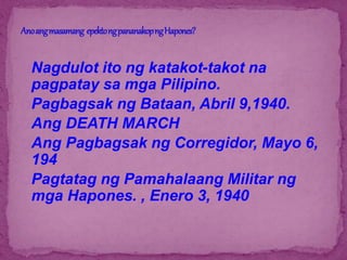 Mga militar na Hapones ang nagpatakbo ng pamahalaan. What are medical problems that arise from color blindness. Tuluyang natalo ang mga Hapones noong 1945.